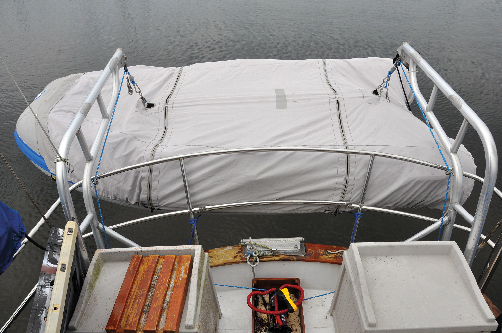 The rigmarole of stretching a cover over a dinghy in choppy water prior to hoisting it on davits can become a very wet business if