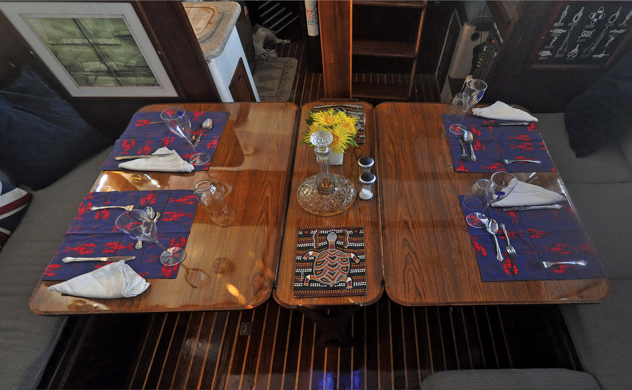The original saloon table in my Down East 45 schooner was a single heavy sheet of 3/4in laminated plywood, 27in wide by 57in long. It