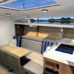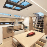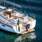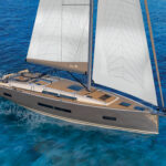Aft, the boat features a large cockpit opening onto a drop-down swim platform, twin helms and twin rudders. Forward, a nicely sculpted combination anchor roller and sprit blends seamlessly into the boat’s nearly plumb bow. The rig has also been expressly configured for shorthanded sailing, with a slightly overlapping headsail standard (for easier tacking) and a self-tacker as an option—again in keeping with the latest trends.