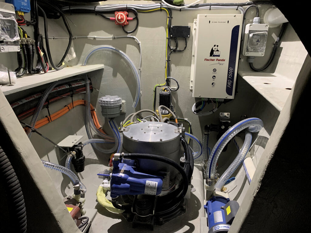 The house bank aboard the R5 includes twin Torqeedo Power 24-3500 batteries. There’s also a DC-to-DC converter for charging. Speaking of charging, there are no less than four different ways of putting power into the batteries aboard the R5: a 2.4 kWh solar array on the Bimini; the genset; shore power; and hydro regeneration, which can begin creating meaningful amounts of power at 10 knots. There is also air conditioning, two fridges, two freezers, electric winches, B&G electronics and an electric stove aboard Oxygen, so the boat is as power hungry as modern cruisers get. Nonetheless, according to Chris Crane of Tampa Yacht Sales, “You always have power when you need it.”