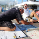 Saturday was refueling day and Mark directed our yacht choreography as we disengaged from our raft-ups at the dock, and came on and off the fuel dock like performers in a chorus line. There was some waiting involved, so I photographed Andy as he retrieved Ocean Magic’s runaway bunting from the top of the Beneteau Oceanis 461’s backstay, and chatted with Josh, aged 20, who had just completed the World ARC with his parents on Mad Monkey, a Grand Soleil 56.