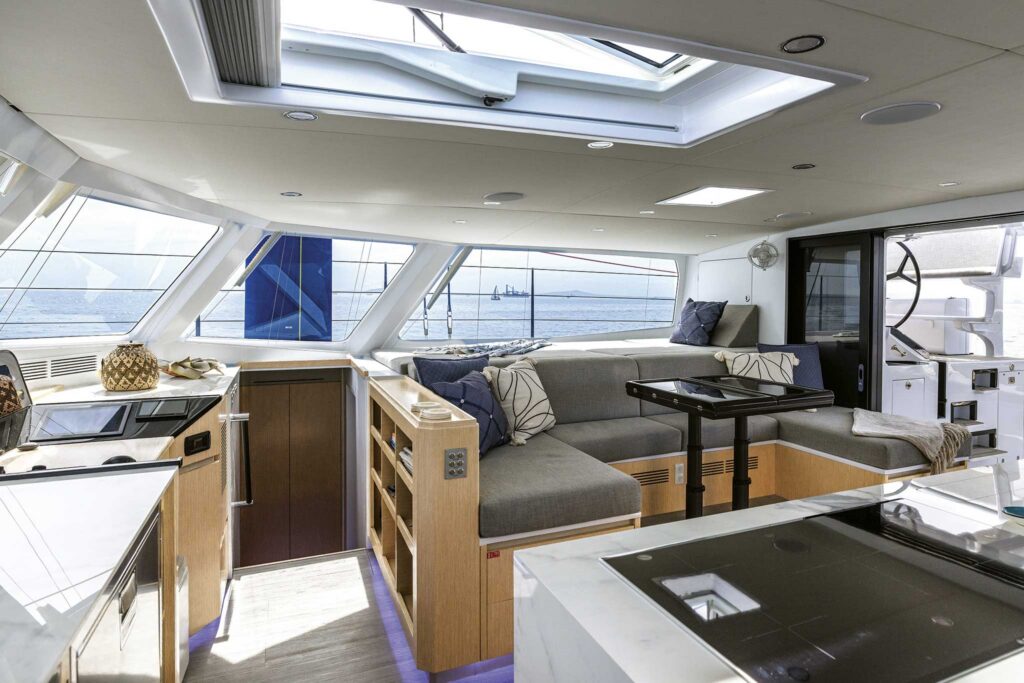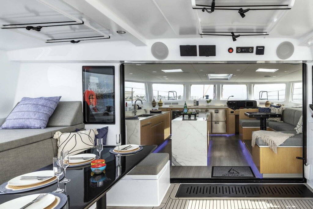 Besides the whiz-bang optional features, the true appeal of Balance catamarans has always been their practicality for real-world cruising. For example, Balance’s trademark VersaHelm pivots the wheel 90 degrees between the upper and lower helm stations. Up top, you’re at the heart of all line handling with four winches and multiple arrays of line clutches while at the lower helm, you’ll find repeaters of all electronics and the ability to drive from a sheltered environment in the cockpit with good visibility through the solid glass cabinhouse windows. Anyone who has had to hand steer in a squall or freezing headwinds will appreciate this. Our test boat took it a step farther with an innovative sliding helm console that is stowed like a drawer in a starboard bulkhead when not in use. Along with an optional flip-up seat at the lower helm, these features stow away to clear the cockpit and provide room for kids to play or adults to do yoga. This was a dramatic departure from the standard arrangement of a fixed lower helm and it demonstrates the lengths to which Balance will go to make it work for the owner. “There are no stock boats,” says Berman. “There are 5-6 basic configurations but the potential for personalization is nearly limitless.”