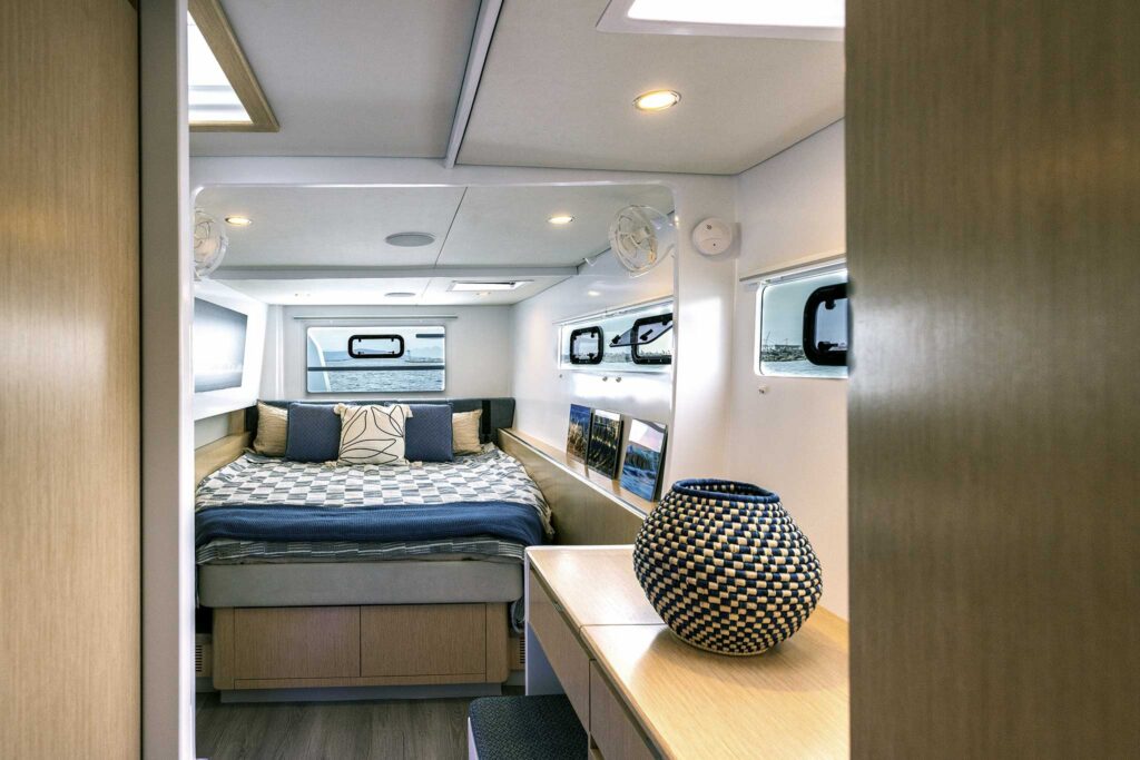 Besides that nifty sliding helm console, our test boat leaned heavily on other customized features. Where there would normally be a head or a crew cabin in the starboard bow, we found a fully outfitted workshop with tool stowage. Meanwhile, the aft starboard cabin switched up from guest accommodations to an office with folding cushions. And the bows had giant opening hatches that Balance calls Bombay doors to stow the owner’s surfboards and kite sailing equipment.