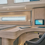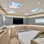 The master suite layout is a nod to the styling on much larger yachts with an array of four overhead hatches and a bed that’s inverted and offset to starboard. The bunk is hidden from view from the rest of the boat and adds to the owner’s privacy.