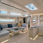 The helm was finger light, and the twin rudders tracked beautifully regardless of the angle of heel. She felt light and agile, cutting through the light chop. Per company representatives, only 10% of buyers are expected to take a traditional mainsail on the V-boom, while 90% opt for in-mast furling. Also, only 20% are expected to have a professional captain, because this large boat can be managed by two without much trouble.