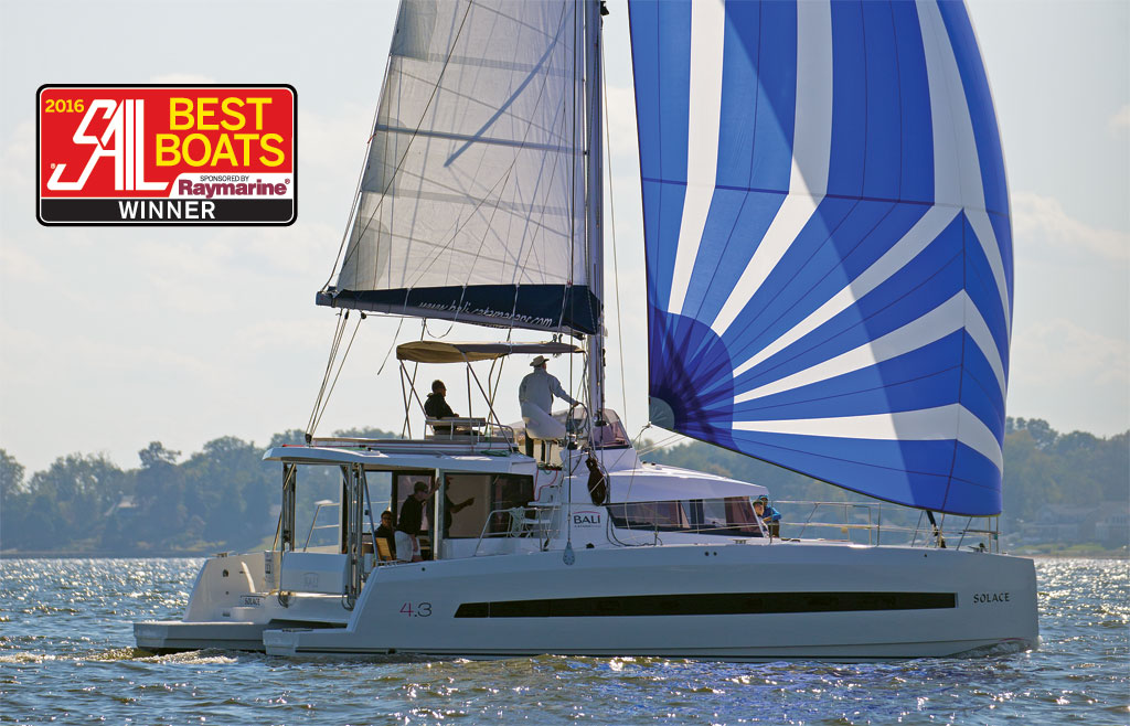 The Bali 4.3 is all about maximizing space both topsides and belowdecks. However, to retain performance, the designer made the hulls flare to distinct chines just above the waterline, so that the underwater sections would remain narrow and efficient. This also ensures plenty of reserve buoyancy, an important feature in a boat with a solid foredeck like this one.