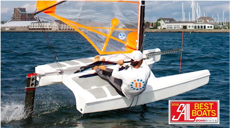 By contrast, getting the Foiling UFO out to where you can hit the throttle is easy as pie, thanks to the stability provided by its two hulls. In fact, the boat—which employs a Moth-style wand connected via a linkage to a T-foil daggerboard for the purpose of controlling altitude—is equally happy sailing in conventional displacement mode, whether just knocking around or taking a break between flights. As for price, $7,600 covers the complete package—less than a third of the cost of a Moth and almost $4,000 less than the Moth’s production one-design offshoot, the Waszp.