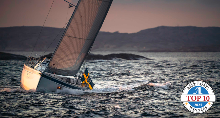 The cabin house is farther aft so the rig sits forward, outside of the salon and on deck where it’s framed by steps leading from the foredeck to the coachroof. Her low profile also means even short crew can stand on the Bimini and manage the main in the sail bag without problems.