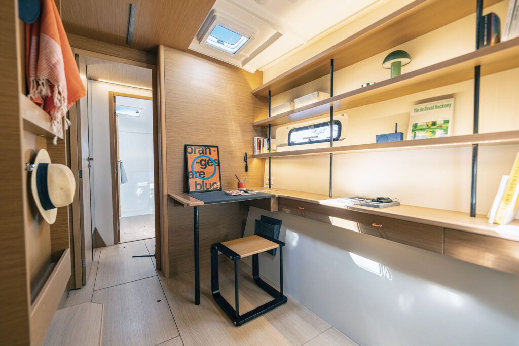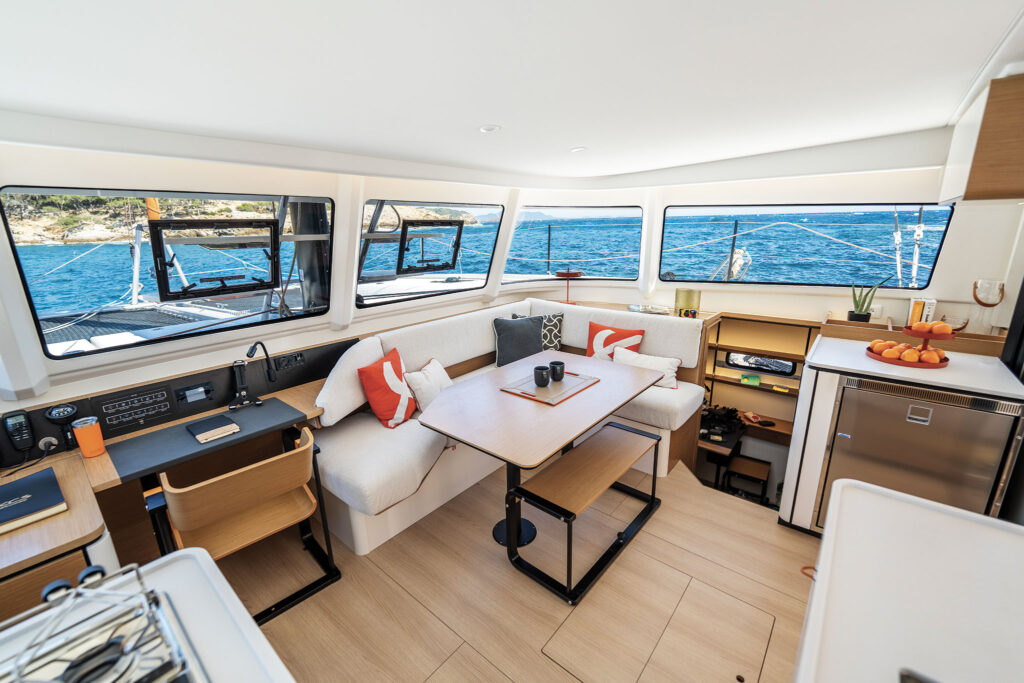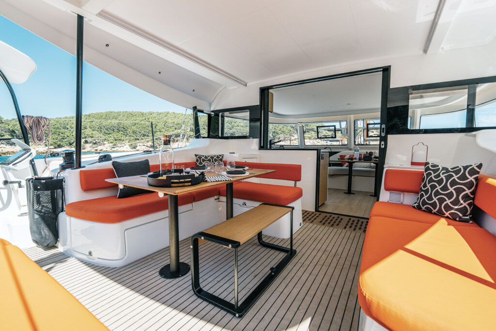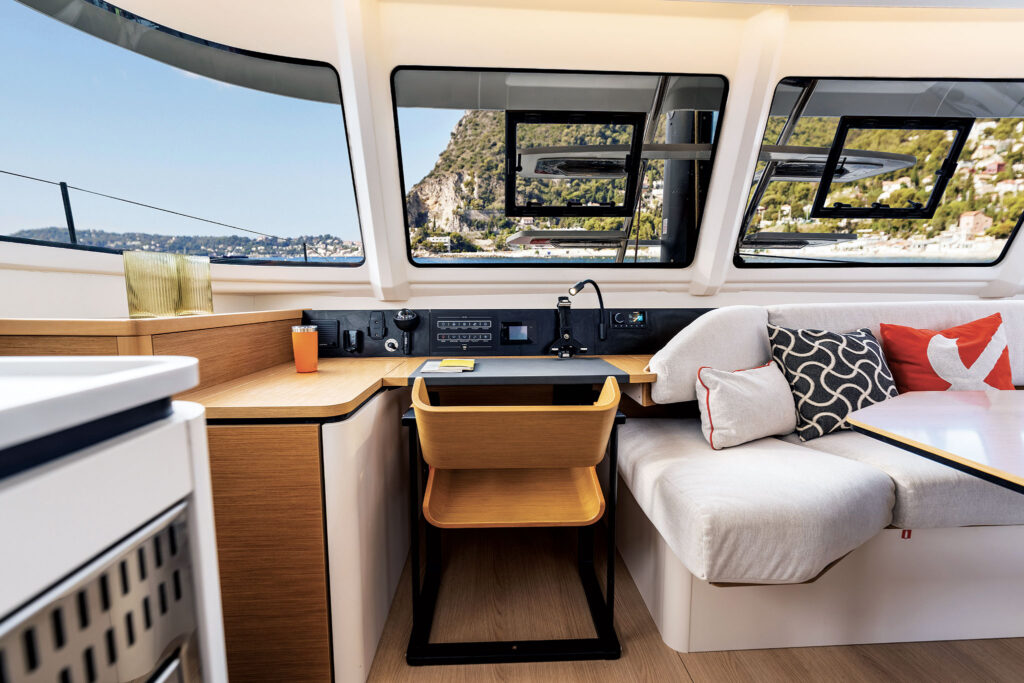 The cockpit is flush with seating options including a transom seat, a dinette to port, and a double lounge to starboard. Between the dinette and the galley window is a latitudinal narrow strip of space that terminates at a cabinet on the port side. Excess is pitching it as bonus space where people will gather to keep the chef company. Instead, it may become a designated space to add a drinks cooler or toss fins and shoes to keep them from being underfoot. Of course, that risks the space becoming a giant exterior junk drawer, so we’ll see how cruisers use it.