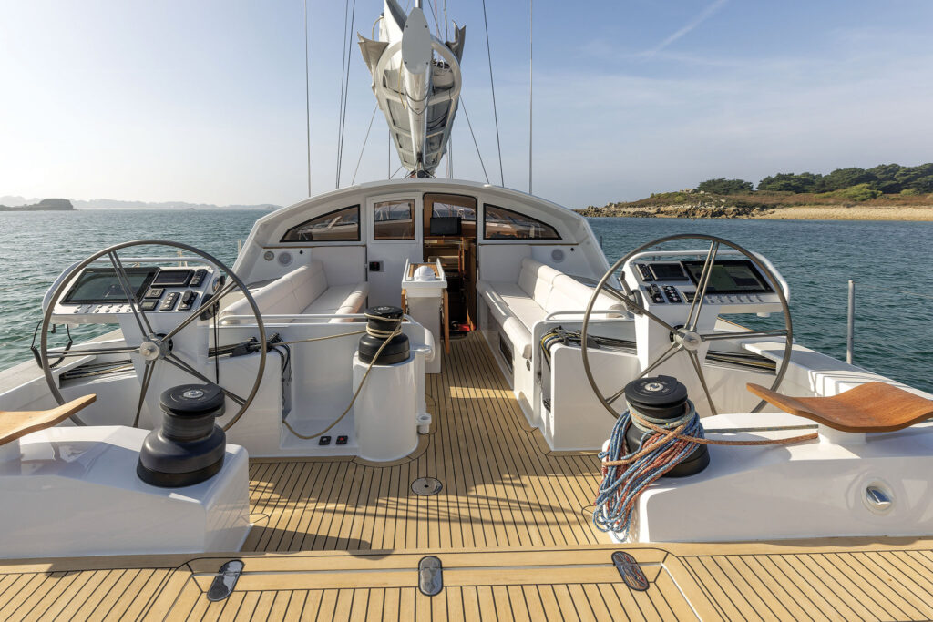 Although we never heeled any more than 15 degrees, the lifting helm platforms provided a welcome height advantage when standing and undoubtedly reduced fatigue by leveling the deck. We comfortably tacked through 90 degrees and settled in at 8.5 knots boatspeed in the 15 knots of wind on a close-hauled course. A full-hoist composite North main, set up with slab reefing for simplicity and performance, balanced nicely with the jib of the cutter rig. The staysail remained furled, but like the jib, was also on a traditional ProFurl drum furler. These were operated from powered XT76 Antal winches in the cockpit and offered a robust headsail furling solution for remote and unforgiving climates.