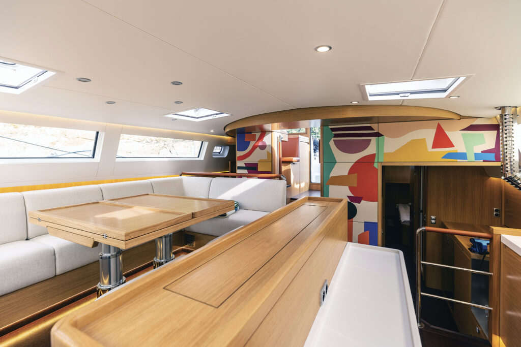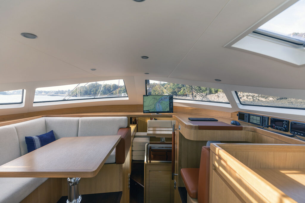 Three wide steps, with a secure handhold, lead down to the salon that features a French oak finish throughout. Plush seating wraps around a large table to starboard, and a slight elevation provides views out the cabintop ports. The table even drops down to create an additional berth, and a lifting TV is hidden in the adjacent cabinets amidships.