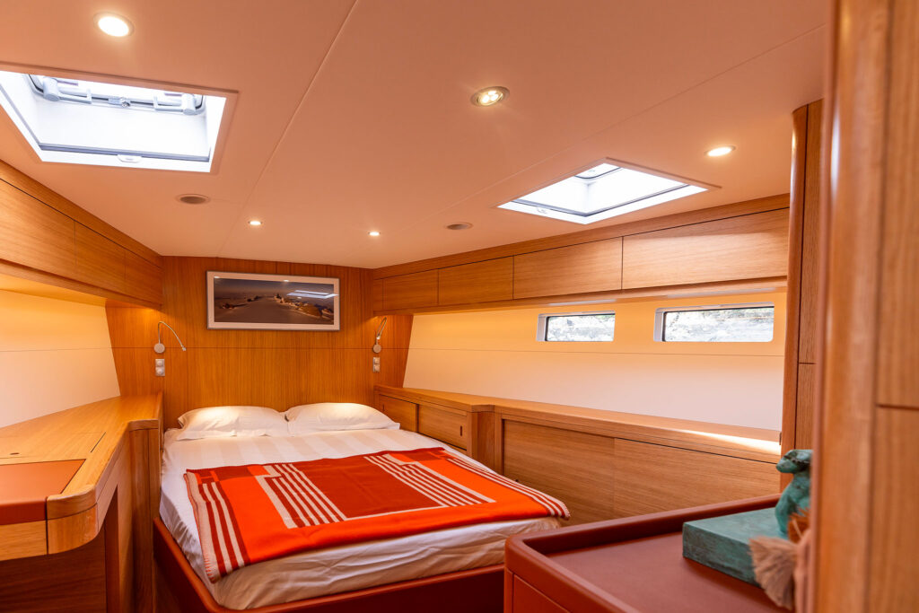 The owner’s cabin is forward and past the third guest cabin but aft of the large watertight sail locker, providing plenty of width and ensuring a good sense of space. The double-pane portlights and hatches provide a great deal of light and a cozy feel is maintained by the tasteful joinery. The owner’s cabin also includes a desk, a vast amount of storage, and a head with a separate shower.