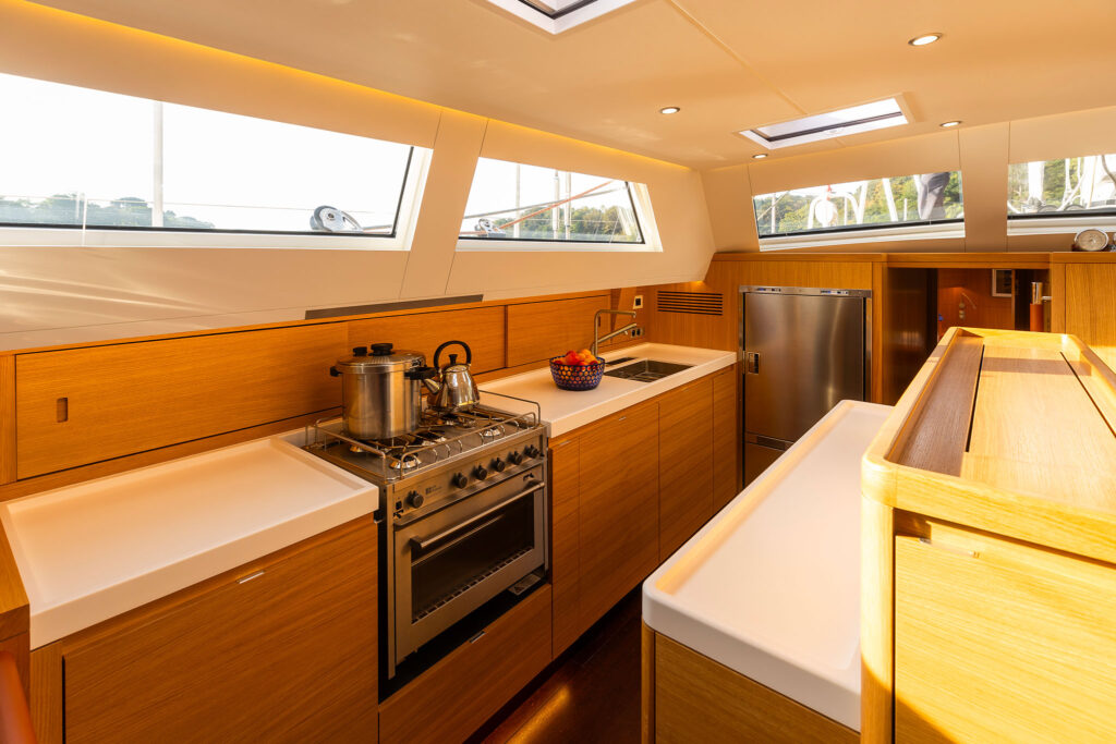 The galley complements this space to port. Food and cookware storage is extensive, and fiddles on the counter and a well-proportioned corridor reveal its seaworthy ergonomics. A gimbled propane stove sits near a trash compactor and the primary fridge and freezer. Long term dry food storage is underneath the stained oak floor panels.