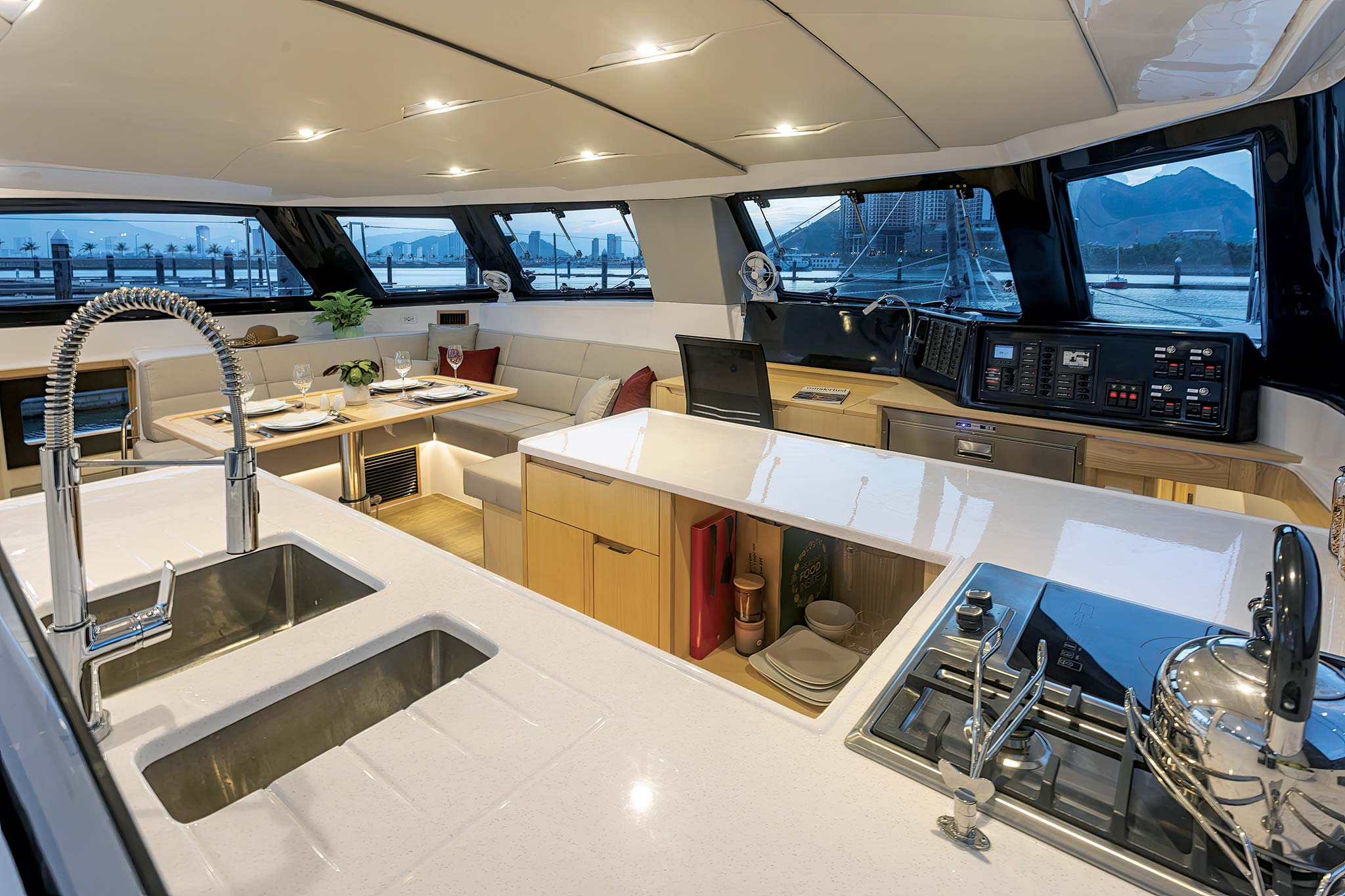 The trifold door separating the salon from the cockpit is snugged up under the bimini with the help of a winch. Seawind considers this arrangement one of its signature features, and for this boat the load has been lightened with some strategic use of carbon in the door hinge. A grill and sink are tucked into the transom structure. The helm seats are wide enough for two, and the backrests swing forward to create aft-facing seating for social hour.