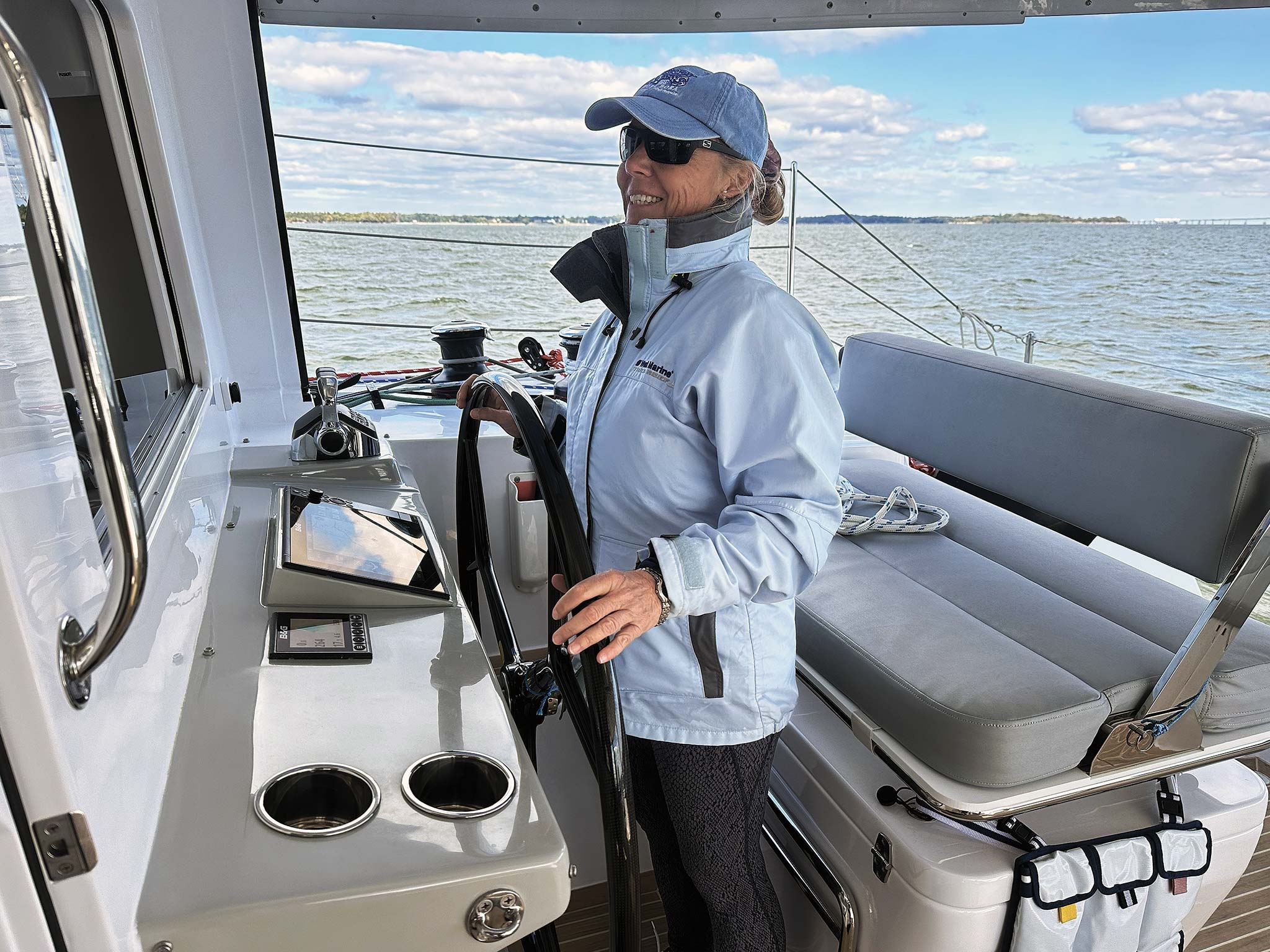 Hull No. 6 was upgraded with twin 57-hp Yanmar diesels with GORI folding propellers and standard saildrives. Engine throttles and B&G 12-inch plotters were at both port and starboard helms. We found an easy cruise at 1,800 rpm where we made good 6.8 knots. On the flat waters of Chesapeake Bay, there wasn’t the chance to motor into a heavy seaway, but the 1370’s 2-foot, 9-inch bridgedeck clearance should minimize pounding when going to weather.