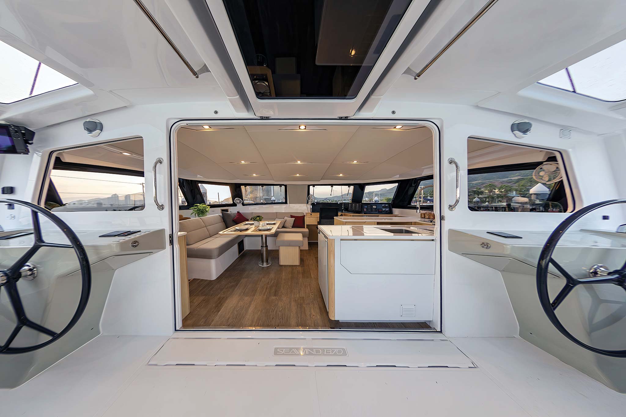 The wheels are mounted on the aft bulkheads of the cabinhouse and are protected by both the hardtop above and the salon ahead. Overhead skylights provide a clear view of the mainsail, and sitting outboard on the coaming shows the jib telltales. The bulkhead windows drop providing sightlines through the salon all the way to the bow.