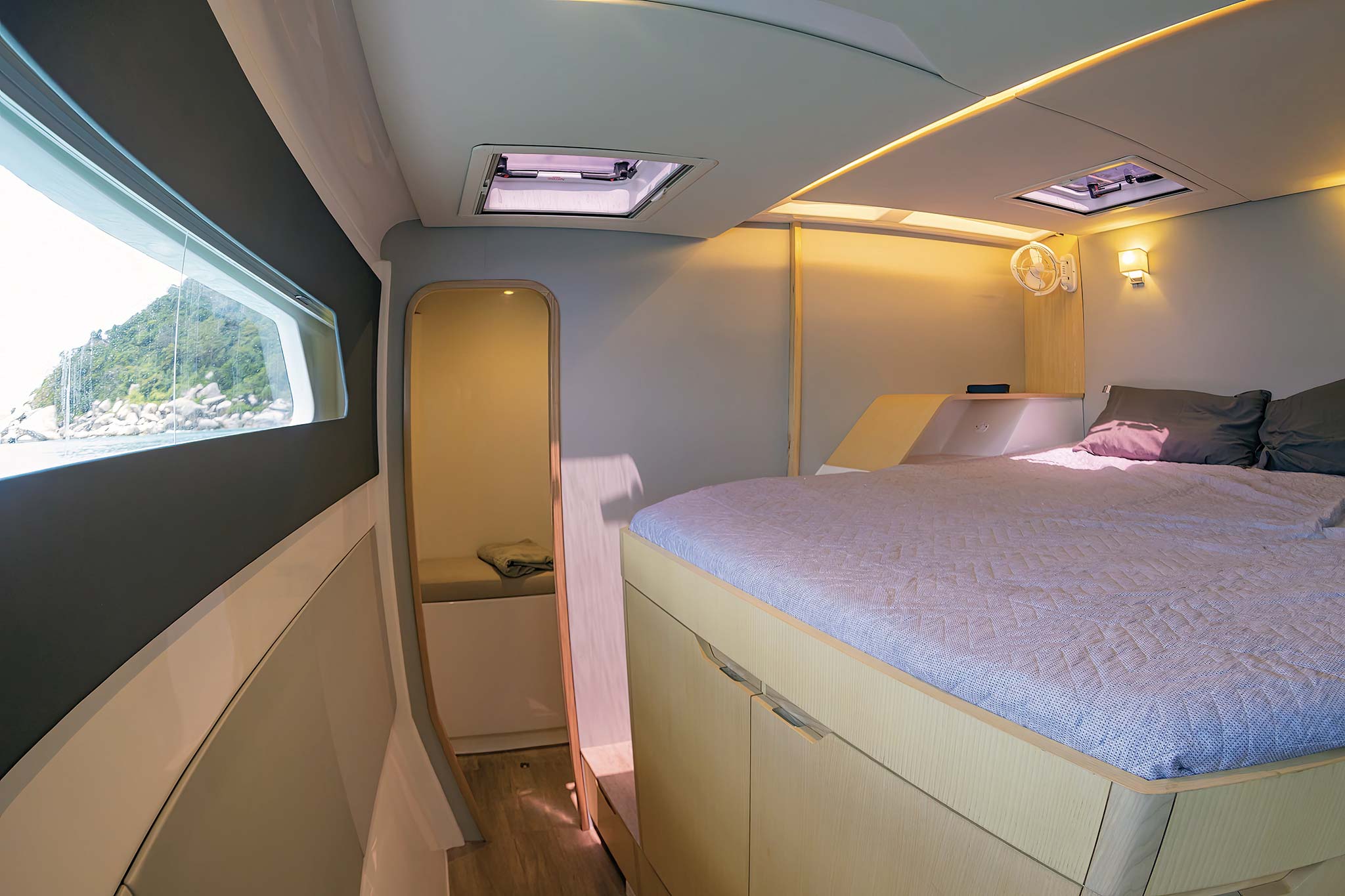 The three-cabin layout dedicates the port hull to the owner’s suite, with an elevated athwartships bed forward, a vanity amidships, and a large head aft. To starboard, our test boat had two cabins with a shared head.