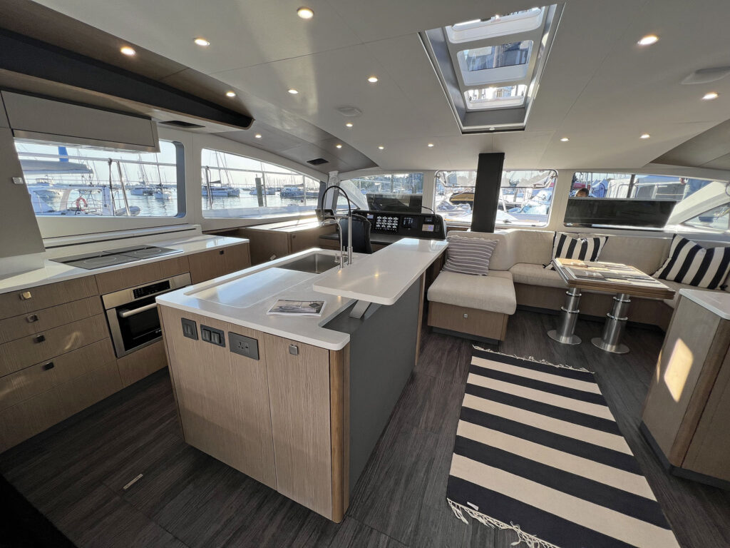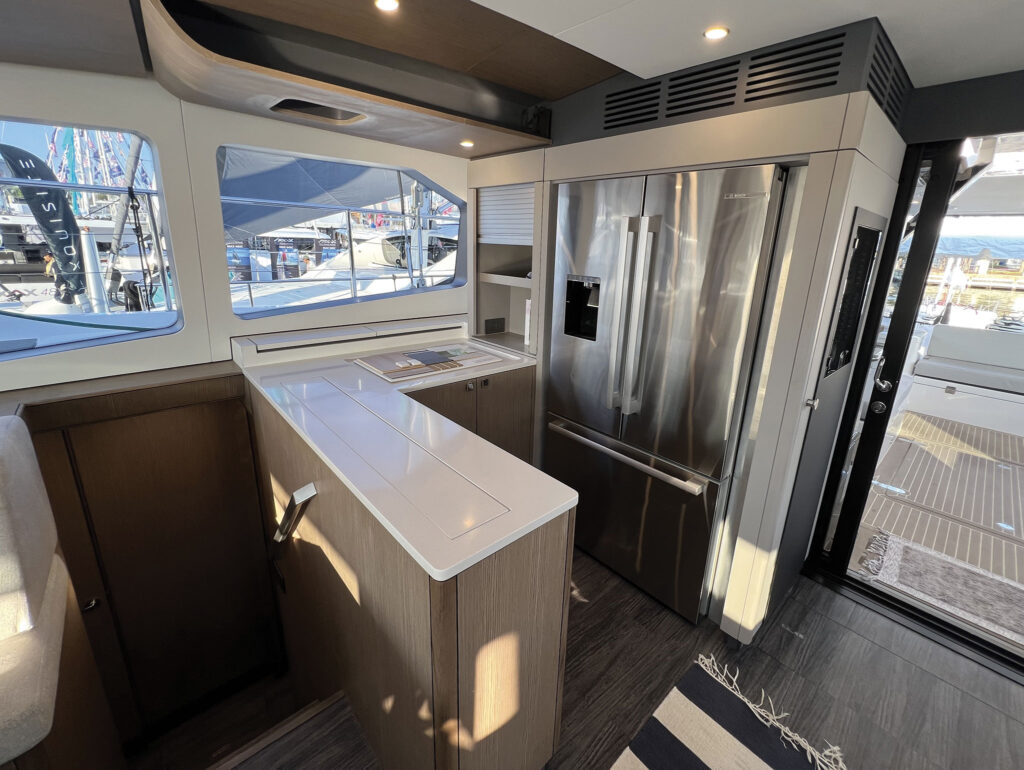 The transom is a bit of wizardry. The toy garage below the seat can hold three full-sized stand-up paddleboards, while the locker below the nearby galley module on starboard hides a dive compressor to fill the tanks tucked into their dedicated locker below the cockpit steps. Overhead and embedded into the arch is a shower, so when you’re done swimming or diving, you can rinse off your gear as well as yourself. With the expansive platform and access to all kinds of toys, the aft deck has a beach club vibe.