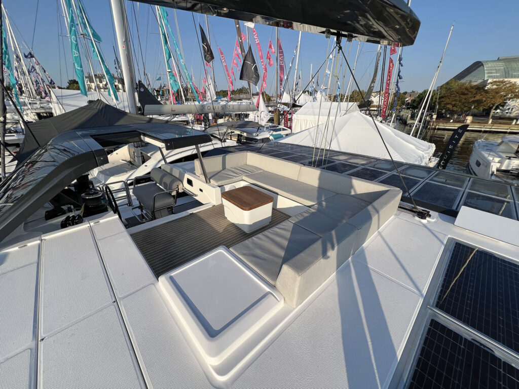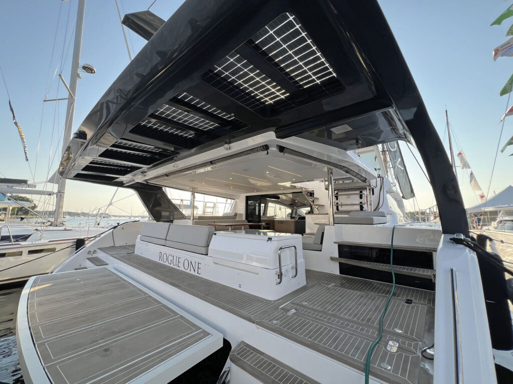The solar array seems omnipresent, as it must be to keep everything running. The tempered glass panels on the bimini, arch, and coachroof are hinged and vented, which increases their efficiency and longevity over embedded plastic panels. Solar panels also extend aft over the end of the arch, providing shade over the platform and tender below but still allowing enough light through for an interesting effect.