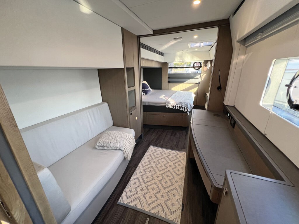 Conveniently at deck level, the helm is a cocoon protected by an aft-swept, glass, double-wide windshield and a slick hardtop, so when hull No. 1 spent 36 hours bashing into Atlantic head seas, the delivery crew remained somewhat comfortable. The C-shaped coachroof lounge on the “fly deck” is directly connected to the helm station so the skipper never feels alone on watch. The clever shade system integrated into the V-boom elicited a collective “whoa.” Electric “bat wings” deploy on struts creating shade for the lounge below. For anyone who’s tossed a tarp over the boom for sun protection, this is that, but on Star Wars-evoking steroids.