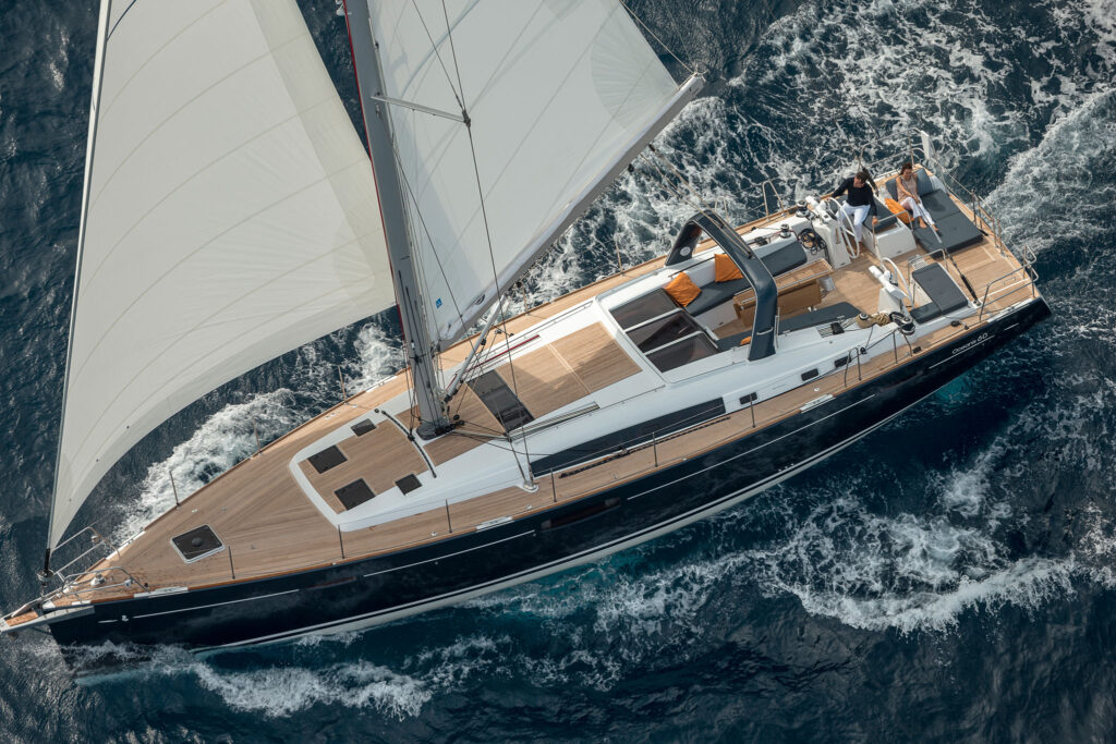 The new flagship of Beneteau’s ever-expanding range, the Oceanis 60 is a development of the Oceanis 58. She sports an aft deck and a tender garage with an electric fold-down transom and swim platform to enclose it. Beyond that, the Oceanis 60 is simply a spectacular boat, well suited to passagemaking, a boisterous daysail or lounging about on the hook on a sunny day.