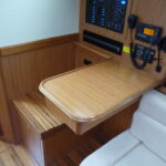 Our test boat was generously powered with a 54hp Yanmar diesel engine. Turning just 2,000 rpm she made 7.9 knots in relatively flat water with neutral current. When I goosed her up to standard cruising revs at 2,200 rpm, speed increased to 8.2 knots. With the throttle down all the way, the engine turned 2,900 rpm and the boat made 9.2 knots. The boat turned within a single boat-length and was easily controlled when backing down. The standard two-blade propeller did take a while to bite when changing direction.