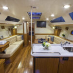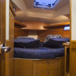 I tested the two-stateroom version of the boat, which features a generous aft stateroom with a large island double berth under the cockpit and an almost equally large double stateroom forward. Both of these have en-suite heads with segregated shower stalls. Vertical clearance in the aft stateroom was a bit limited on our test boat, but, again, I’m told by Marlow Hunter that this will be improved on future boats. There is also a three-stateroom layout with smaller twin double cabins aft.