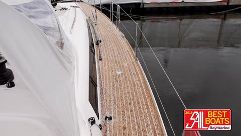 This boat is particularly easy to move around. The side decks are wide, with chainplates set well inboard and genoa sheet tracks hugging the cabintop sides. Keep the spinnaker pole on the mast—as on the test boat—and the decks are completely unobstructed. If you’re one of those sailors who like to go barefoot, you’ll love this boat. Long stainless steel grabrails terminate just short of the mast, and low teak-capped bulwarks provide just enough security for those working the foredeck. There is a deep anchor well housing a Quick electric windlass as well as the furling drum. The single bow roller should be adequate for most anchoring situations. Mooring cleats at bow, stern and amidships are all well sized.