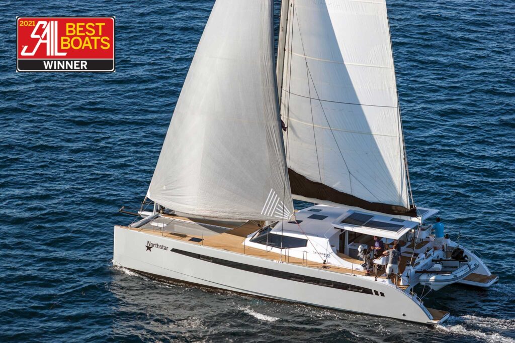 Aft of the navigation area, the galley faces directly out onto the cockpit for passing food and drinks and offers plenty of surfaces to brace yourself against when cooking offshore. Granted, cats don’t heel much, but cooking in a sloppy seaway surrounded by a bunch of hot stuff is never fun. Overall, the finish belowdecks is up-market and then some. Thoughtful features include a number of pull-out drawers tucked in behind the flat-screen TV in the saloon—a great use of space.
