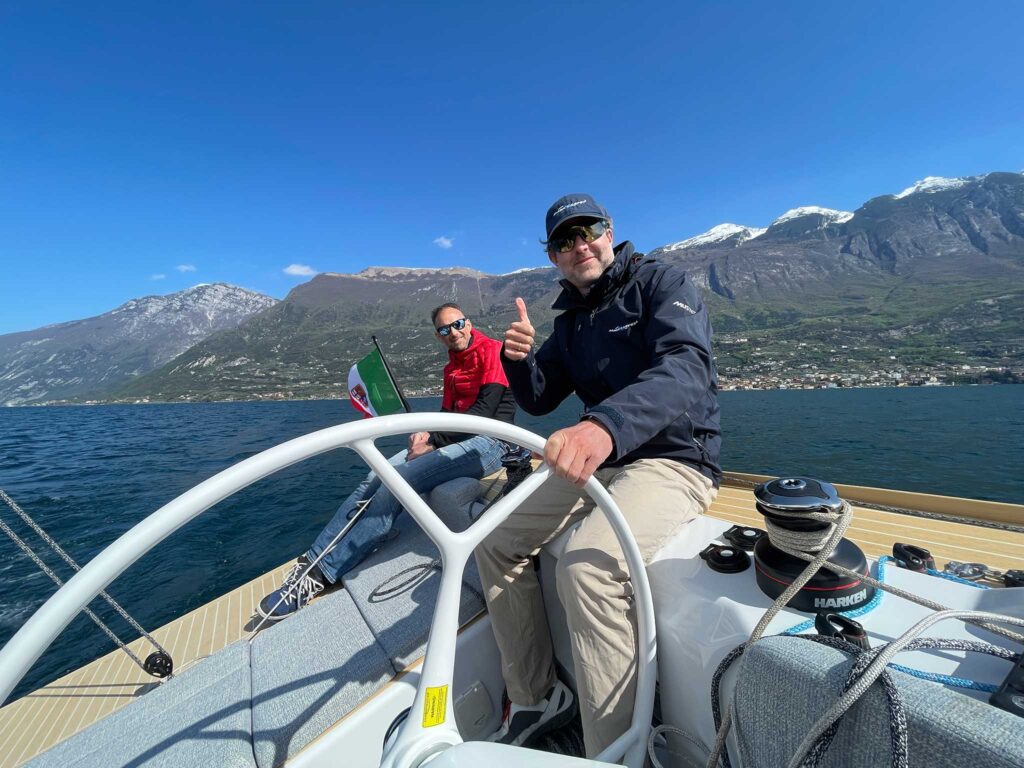 Initial impressions are certainly beguiling, but as we stand at the dock, it is clear that the conditions aren’t playing ball. The waters of Lake Garda are barely troubled by the faintest zephyr. The famous northerly Pelèr wind which usually enlivens the mornings is a no-show, so sailing must wait instead for the southerly Ora to kick in after midday.