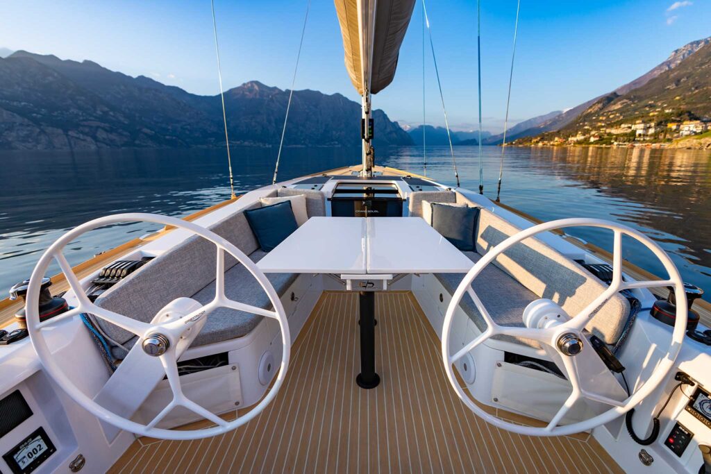 A 4-foot, 4-inch fixed bowsprit defines one end of the boat, with a broad, flat V-shaped stern at the other. There’s a generously long cockpit which continues past the twin helm stations to a kind of aft deck sunpad, and for much of our test sail, Matteo Polli lounges here, trimming the mainsheet traveler. But it can also serve as what Nauta calls a “further cockpit” facing aft, by swinging open the bathing platform that forms the transom of the boat.