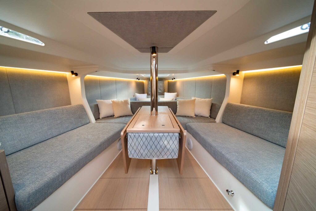 As you’d expect in a yacht designed for only occasional overnighting, the interior is fairly simple and open to the forepeak. Bench seats line the hull and there’s a fold-down carbon table built around the stainless steel mast support on the centerline. The forepeak is filled with upholstery and makes a comfortable double V-berth. The two side benches can also serve as additional singles—delivering the boat overnight, for instance, or sailing with children.