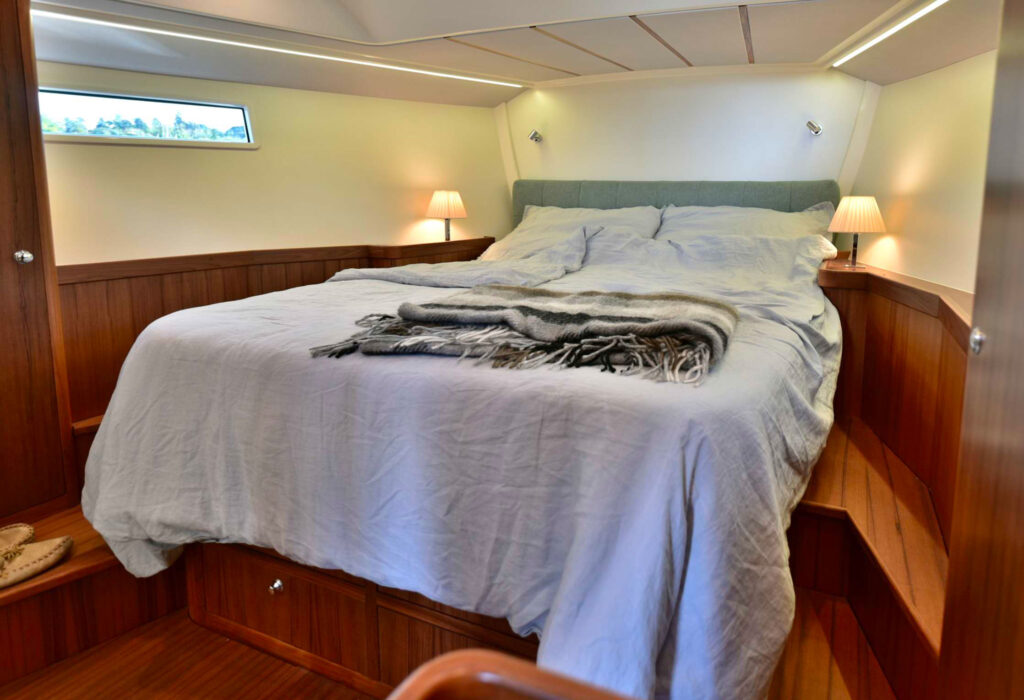 Propulsion comes from a 57hp Yanmar or 75hp Volvo engine and saildrive with a three-blade folding prop. A powerful Sleipnir bow-thruster is included as standard. The boat hits hull speed under power, and I clocked 6.2 knots at half throttle, albeit with a following wind. As the engine is inaccessible from the interior of the boat, noise levels are extremely low—especially in the salon and the master cabin.