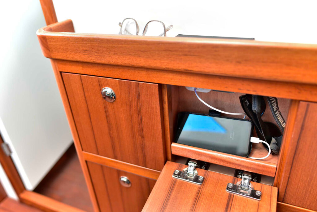Down again, there’s a nook outside the cabins with a small table and an L-shaped sofa which doubles as an occasional berth with your toes tucked in under the galley. Sitting here, you could watch a TV mounted on the bulkhead opposite, plough through emails, or simply eyeball a new anchorage through the hull light nursing a cup of tea. The orderly minded will also love the bank of six small lockers, each with dedicated charging points—ideal for every crew member to store mobile phones, sunglasses, and other paraphernalia.