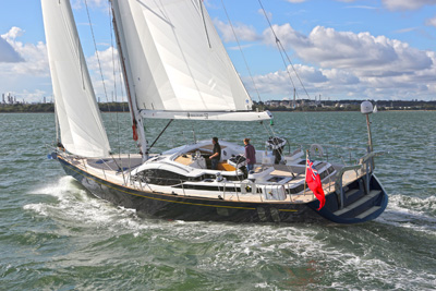 The keel-stepped double-spreader, alloy mast is supported by discontinuous cap, intermediate and aft lower shrouds made of low-stretch Dyform wire. A carbon spar is optional. The Solent rig pairs a self-tacking high-aspect jib for ease of handling with a 140 percent genoa for additional horsepower. Electric in-mast mainsail furling is standard, but a battened slab-reefed main can be specified. The mainsheet traveller runs along the afterdeck and sheets to an electric winch on the coachroof, where it is unfortunately out of reach of the helm. The jib is also controlled by a single sheet on a coachroof winch. The genoa sheets are led aft to electric primaries, just forward of the helms.