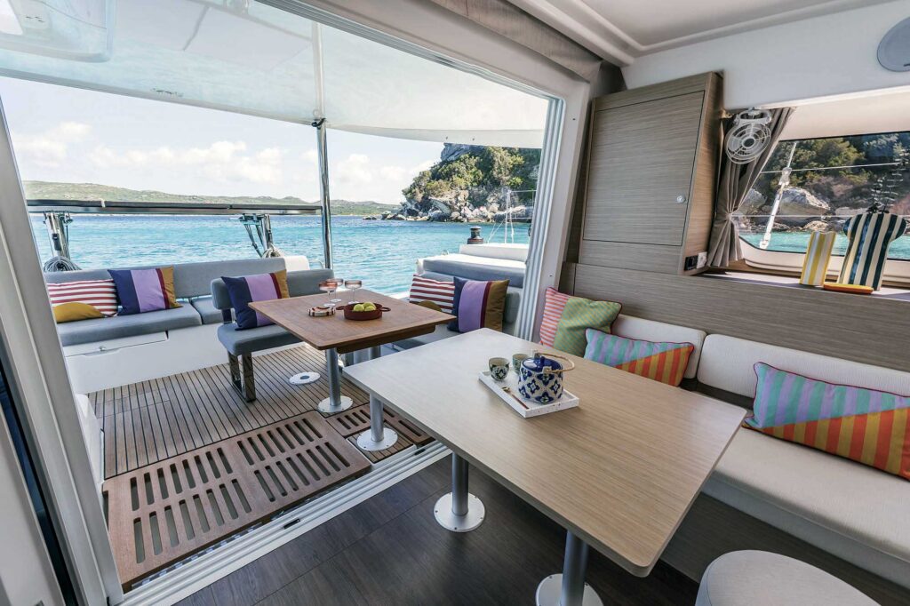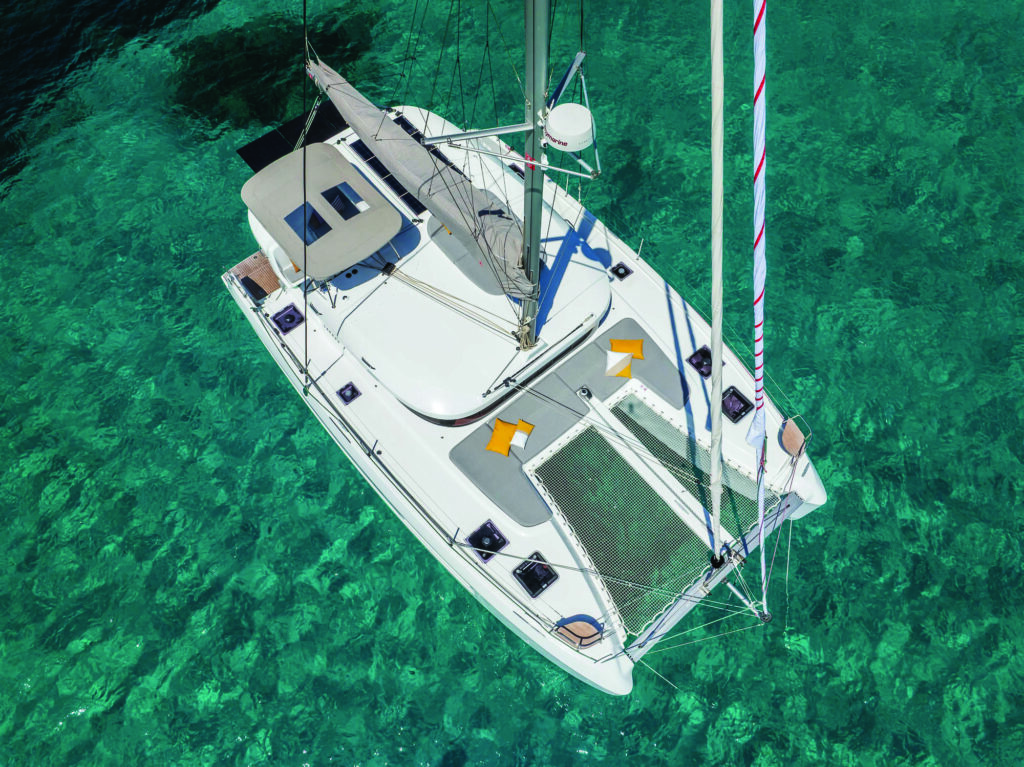 A VPLP design, the Lagoon 38 is the second model in the French builder’s new generation, following the Lagoon 43 that launched just last year. The new design conjures up generously proportioned living spaces in modest specifications. She follows her big sister’s layout both on deck and inside, and it seems every inch has been leveraged and pressed into service.