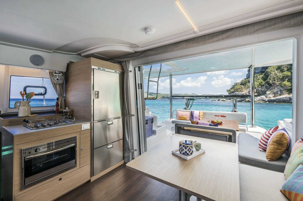 A three-panel glass door separates the cockpit from the salon and tucks up ahead of and below the helm. When open, it joins the two living spaces in an impressive and dramatic manner. The continuity and flow from inside out is this model’s best feature, adding a feeling of vastness that’s not expected in 38 feet. The cockpit dinette to port is completed by a movable bench that can face in or out for on-the-spot layout changes. A wide fixed transom seat is just ahead of the davits and a bench seat is to starboard. That last one makes a perfect place from where to watch the kids playing in the water.