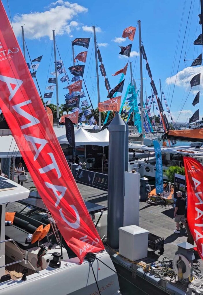 As tariffs and the high costs continue to pose a problem for manufacturers, some big names were notably absent from the flags flying above the sailboat basin. You could almost mistake the docks for the La Grande-Motte’s International Multihull Show for all the cats present. Only two monohulls were at the show, Dufours parked alongside their Fountaine Pajot siblings.