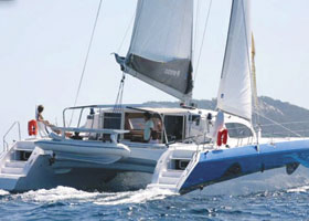 This fast cruising cat from France looks sharp and reportedly performs well too. Twin wheels and a clever hard/soft bimini design are notable features. There are several layout options, and the yard claims to have kept weight down to enable a decent cruising payload to be carried.