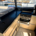 Stepping forward from the cockpit seating, a transparent sliding door opens to the galley. The 360-degree views from this enclosed level are impressive and aid in resolving some of the visibility issues caused by the large coachroof from the helm–it’s easy to see right through both sides. An indoor seating area is forward and to starboard of the galley, and with a lowering table also serves as another spot to get some rest. Across from that is the nav station, equipped with a great view and an optional remote autopilot and remote engine control so that you can helm the boat fully protected from the elements if desired.
