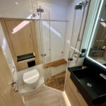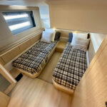 A guest cabin is to starboard, with twin bunks (a double is also available) and the same luxurious type of head arrangement. Storage is a little sparse in these cabins, but a utility room to port (standard) aims to give much of that back and contained an optional washer/dryer unit in this hull. Ceiling height is challenging in this room, but all dry storage space should be welcomed on a boat. This space can also become an additional cabin as an option.