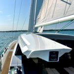 I was able to test sail the first hull in the U.S. right after its debut at the Newport International Boat Show in September, and as we extracted the boat from the complex show docks, the standard bow and optional stern thrusters eased us around tight corners. With these assists, even with the 15-foot, 11-inch beam, the boat escaped into Newport harbor with precision and nimbleness. A clear path between the helm stations, and a Raymarine mast-mounted camera, meant all sides of the DS48 could be carefully monitored from astern. However, it’s worth it to note that this camera is necessary for some forward visibility for vertically challenged sailors who cannot see the bow from the helms due to the position of the hardtop.