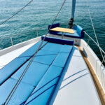 Taking a break from the helm, walking forward felt comfortable and secure. Tall bulwarks are complemented by tall, fixed, stainless railings (as opposed to wire lifelines) and a long stainless handrail is built into the sides of the coachroof (next to 800 watts of optional solar panels mounted on top). The Flexiteek decks provide plenty of positive traction and are available in different colors as an option.
