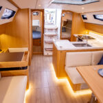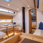 This is also, IMHO, a strikingly handsome boat. Its aesthetic has been refined, most particularly down below, by the iconic French interior designer Isabelle Racoupeau, and it shows. The accommodations have a sleek, very open, modern look, but the layout is still fundamentally purposeful. There’s a good-size nav desk, a galley aft with a large sink near centerline, long straight settees that can double as sea berths, and lots of handholds. Though overall interior volume is necessarily reduced due to the boat’s moderate beam, particularly aft, things do not feel cramped below.