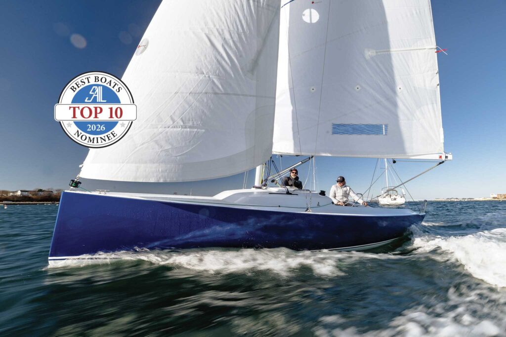 There is plenty of power in the main’s end-boom sheeting, but no traveler; instead a bridle. This still provides a decent level of twist adjustment for the large roach North main in the tradeoff for simplicity and reminds me of modifying racing dinghies for better performance. The backstay is adjustable, with a system that mimics that of the J/24: a trio of blocks on a split backstay. That quick and reliable control is accessible from the tiller and adds a depowering option.