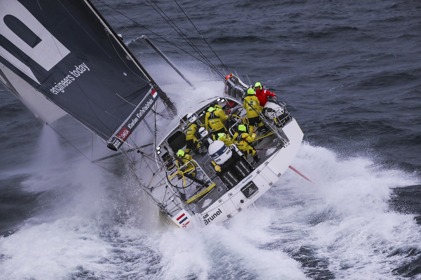 After winning three of the last four legs in the Volvo Ocean Race (and coming in second in the fourth), Dutch-flagged Brunel is now tied