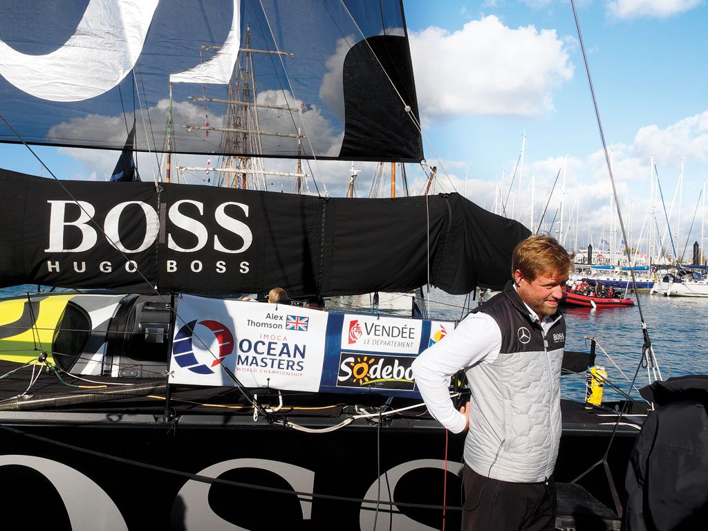 Alex Thomson on the dock in Les Sables d’Olonne, wearing earbuds to drown out the roar of the madding crowd, the day before the start