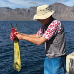 From there we headed for the bay at San Evaristo another seven miles up the peninsula. Suddenly, it was “fish on” as our shipmate Mervyn hooked a dorado. It put up quite a fight and even threw the hook. But by then we had it in the cockpit and were able to dose it with tequila to calm it down. It was just enough for a dinner of “kedgeree,” a recipe we’d found in the guide.