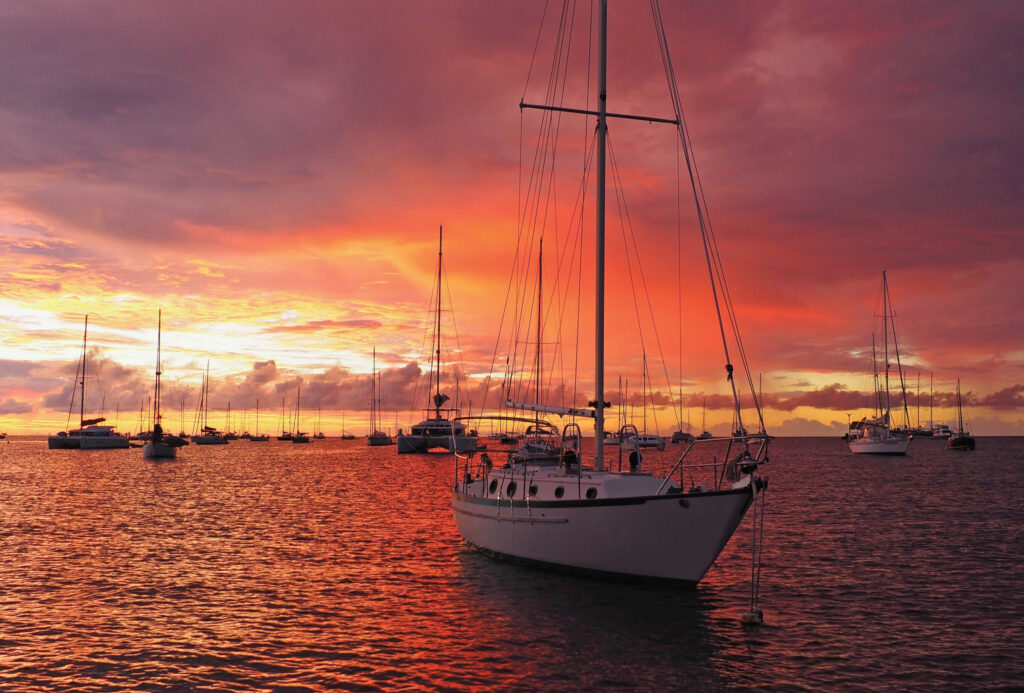 Like a firework celebration, our last fabulous sunset sprayed yachts in the bay red and gold, and the following morning came our final sail back to the Horizon base, another glorious reach, dodging every rain squall we spotted on the horizon and cracking along at 9 knots, parting shoals of flying fish between Carriacou and Grenada. It was some of the best Trade Wind sailing I’ve ever enjoyed.