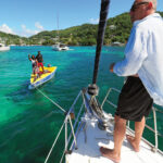 After another early night, we were up soon after sunrise for the 25-mile sail to Admiralty Bay, Bequia’s renowned harbor. Once underway, it proved an exhilarating four-hour beat to windward in 16-21 knots of wind, making 6-8 knots over the ground with one reef in the main and a couple of rolls in the genoa. Later, as we swung gently on our mooring in one of the Caribbean’s most protected natural harbors, I marveled at nature’s amazing palette of blues and greens. Boats buzzed back and forth bringing fresh croissants, fruit and veggies to yachts. There was even a floating water tanker and a laundry boat.